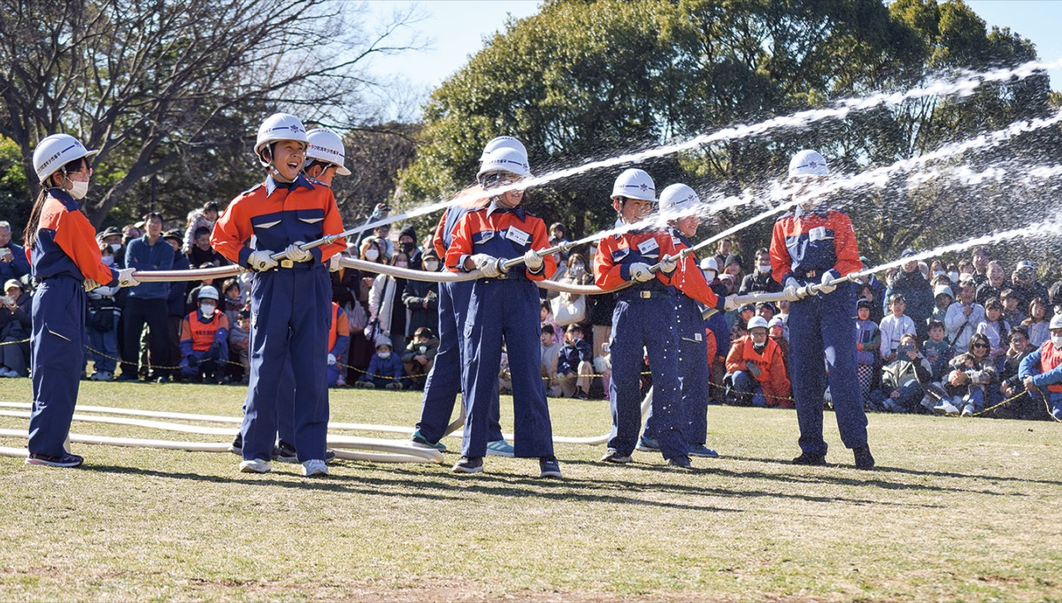 平塚市消防出初式が1月11日、平塚市総合公園の平塚のはらっぱで行われ、消防職員や消防団員、平塚古式消防保存会、平塚市少年消防クラブが参加した。無災害に向けて団結力を高めた。