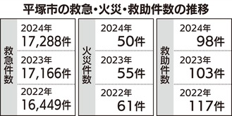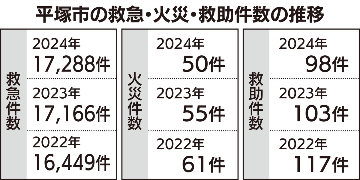 平塚市消防本部は1月6日、2024年に発生した火災・救急・救助の件数(速報)を発表した。救急件数は1万7288件で、23年の1万7166件を122件上回り、3年連続で過去最多となった。