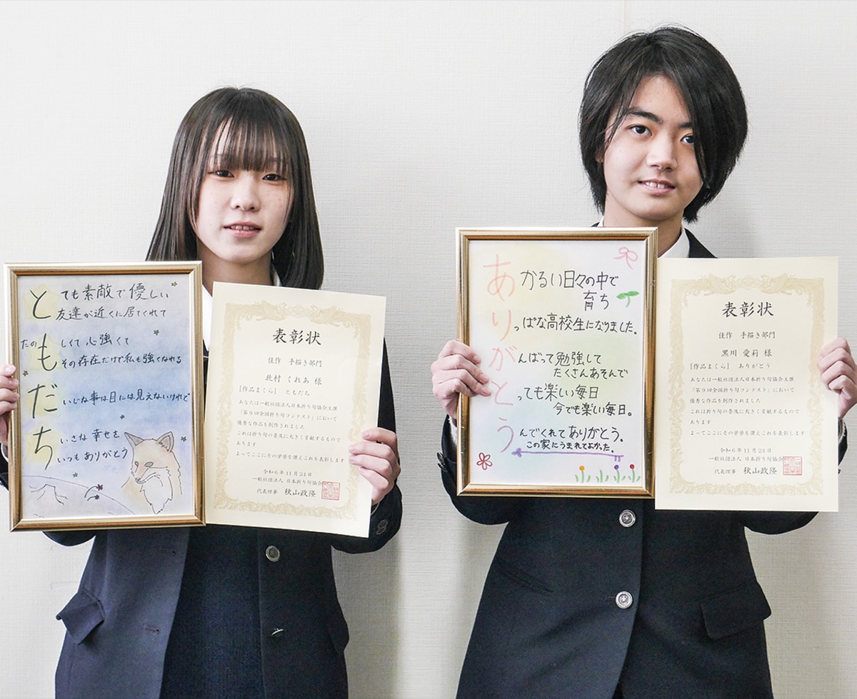 平塚湘風高校の北村くれあさん(3年)と黒川愛莉さん(2年)が、(一社)日本折り句協会が主催する「第9回全国折り句コンテスト」の手描き部門で佳作を受賞した。同部門には、全国から約820通の応募があり、30人が入賞。同校からは、実用の書と書道の授業を受けている約50人が応募した。