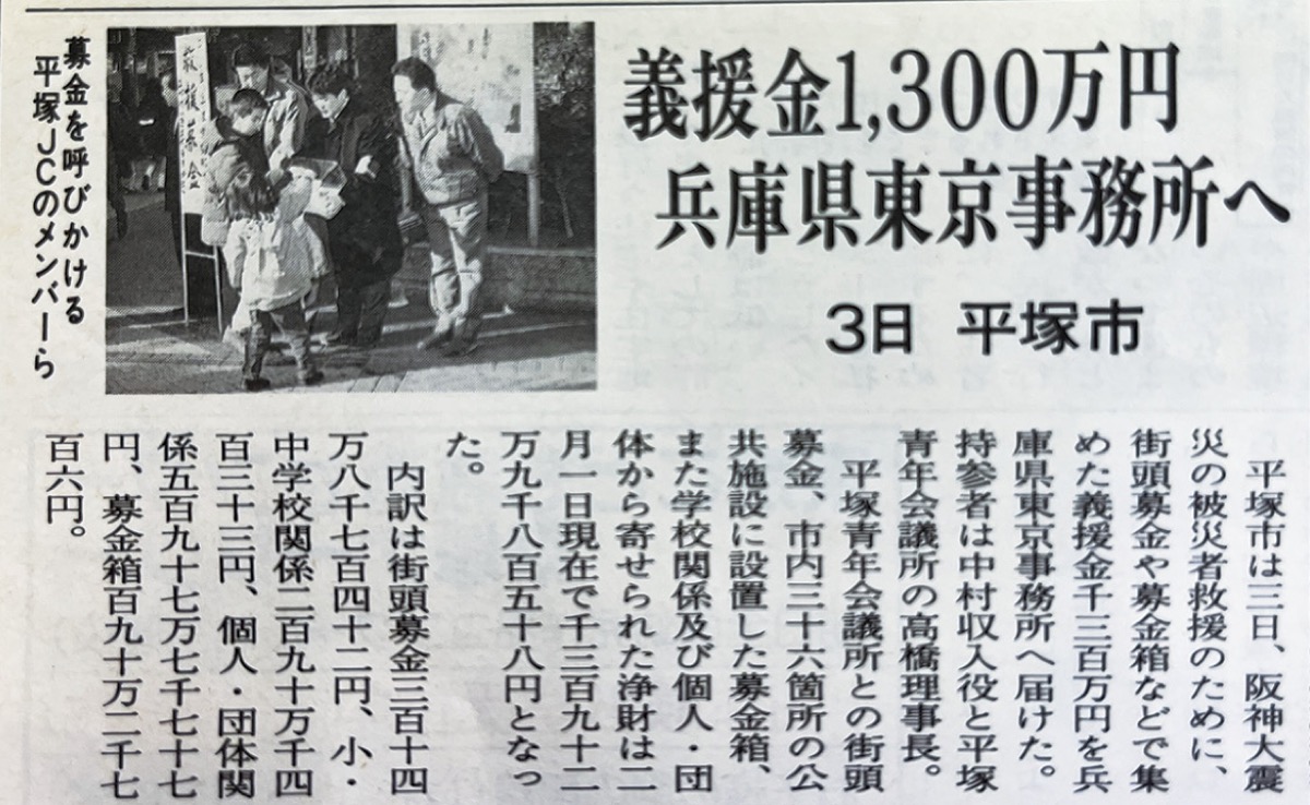 1995年1月17日に発生した阪神・淡路大震災。「戦後最大」とも言われた被害は、遠く離れた平塚にも衝撃を与えた。支援の知識や経験もない中、募金活動や現地で物資の仕分けを行った平塚青年会議所(平塚JC)の37代理事長・高橋昇さんは「第一報をテレビで観て途方に暮れた。鮮明に覚えている」と振り返る。
