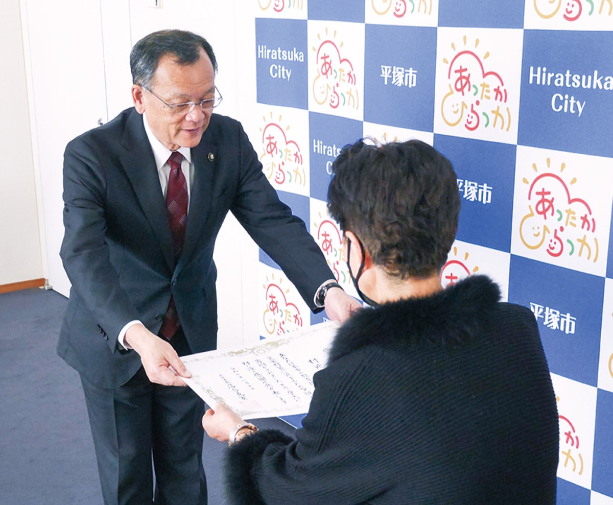 1月10日に平塚市の落合克宏市長から感謝状を贈られた村元さんは「仕事でお世話になった県や市へ何かしたかった」と両者へ感謝を語った。