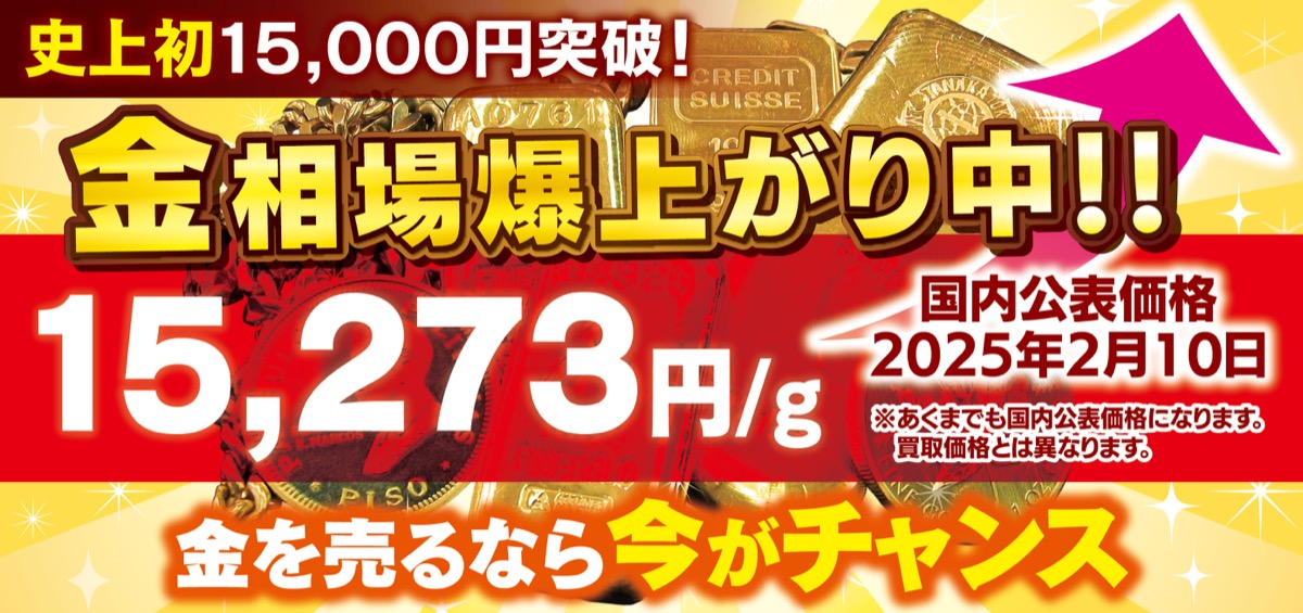金買取価格の”爆上がり”が止まらない。1月23日には史上初の1万5000円を突破し、2月10日現在1グラムあたり1万5273円を記録。「おたからや西友平塚店」「おたからや平塚中原店」「おたからやマックスバリュ平塚河内店」では、「今まで金を売らずに待っていた方、金を売るなら今がチャンスです。ぜひ最高値でのご売却をお勧めします」と話す。