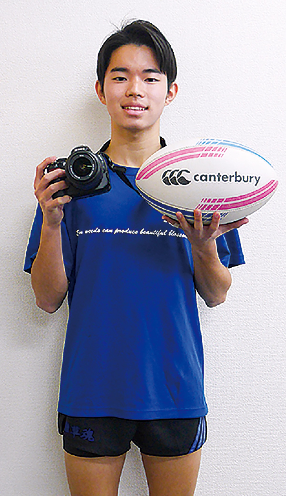 スポーツ写真の撮影方法を学びながらラグビー体験をする異色コラボを企画したのは、中学生の時に美術部に所属していた同校ラグビー部の京田琉聖さん(3年)。「ラグビーをする仲間を増やすために、新しい試みが必要だと思った」と開催経緯を語る。