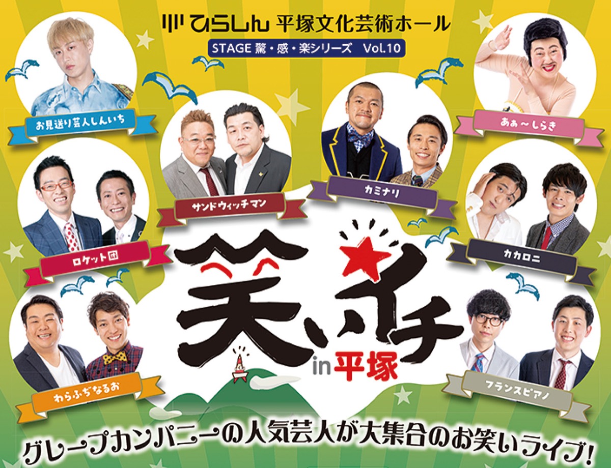 グレープカンパニーの人気芸人が大集合するお笑いライブ「笑いイチ㏌平塚」が5月11日(日)、ひらしん平塚文化芸術ホールで開催される。12時と15時45分の2回公演。3月9日(日)10時より、オンラインで発売。
