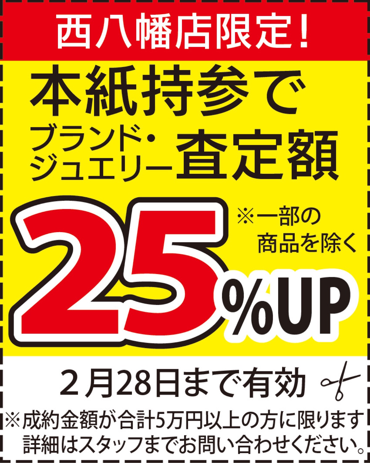 2月28日までは、【1】5点以上の成約で査定額1万円UP(成約金額上限1万円)【2】出張査定と来店予約でさらに査定額1万円UP(成約金額上限1万円※ブランド・ジュエリー以外の商品を除く)。【3】本紙掲載のクーポンを利用すれば、査定額25%アップの特典も。