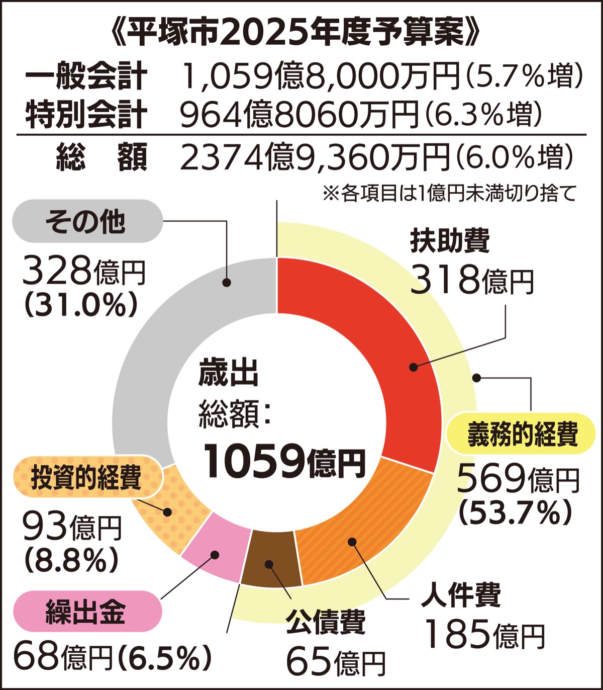 平塚市は2月13日、2025年度当初予算案を発表した。一般会計は前年度比5・7%増の1059億8千万円で、2年連続で1千億円を超え過去最大となった。子どもを育む環境づくりや活気あふれる産業づくり、安心・安全で快適なまちづくりなどを重点戦略に据えた予算編成となった。