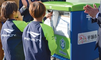 除幕式には湘南ベルマーレサッカースクールに通う小学生3人も出席し、ベルマーレ選手に宛てた手紙を初投函した。