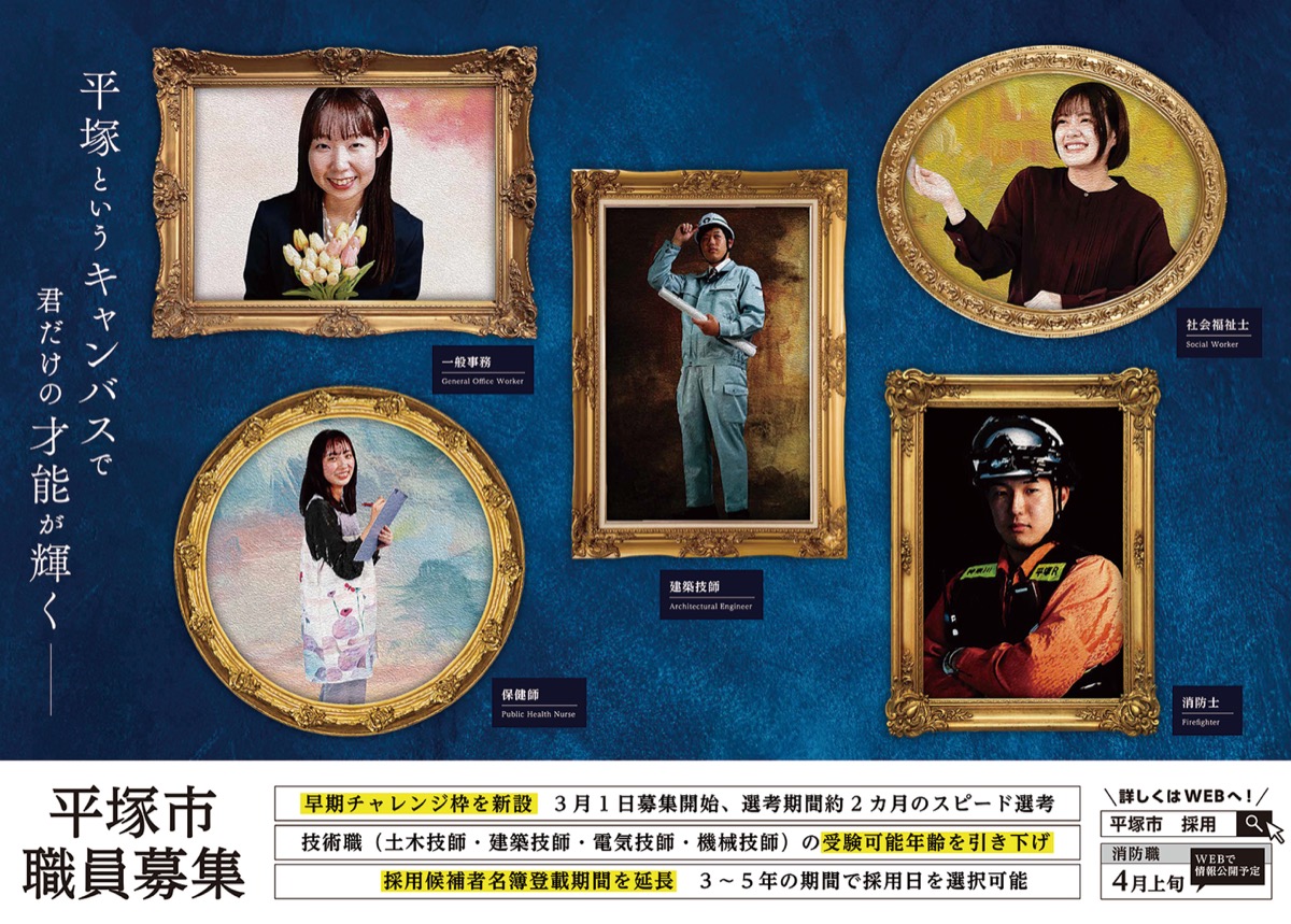 今回のポスターのコンセプトは、多様な職種の職員を紹介するため、美術館に飾られている絵画をイメージしてデザインしたという。ポスターに掲載されているのは、一般職、保健師、消防士、建築技師、社会福祉士の若手職員5人。多種多様なスキルを持った職員が、さまざまな部署で魅力的な仕事をしていることや、採用された場合、平塚という街をキャンバスに自身の活躍する姿を描いてもらいたいとの思いを込めた。