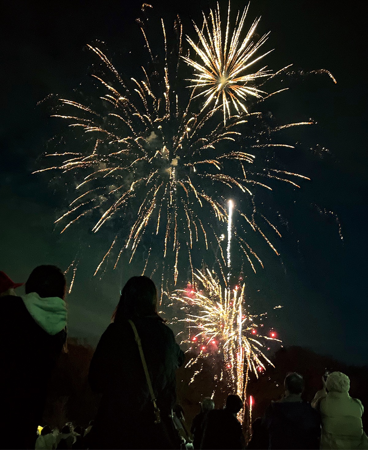 イベントのフィナーレには、2017年1月の青年部創立50周年の記念花火大会以来、8年ぶりとなる打ち上げ花火も行われた=写真。花火が午後6時から約15分間に渡り冬の夜空を彩ると、会場に入りきらないほどの見物客からは歓声や拍手が沸き起こった。