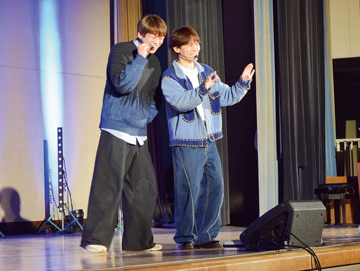 二宮町出身のTATSUさん・SHINGOさんからなるボーカル&手話ダンスパフォーマー「HANDSIGN(ハンドサイン)」が3月3日、母校の二宮西中学校で「地元神奈川県内中学高校100校公演プロジェクト」の100校目を飾る公演を実施した。