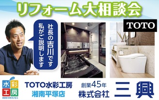TOTO水彩工房湘南平塚店の(株)三興は、5月17日(土)・18日(日)に「リフォーム大相談会」をTOTO厚木ショールーム(厚木市岡田4の3の12)で開催する。
