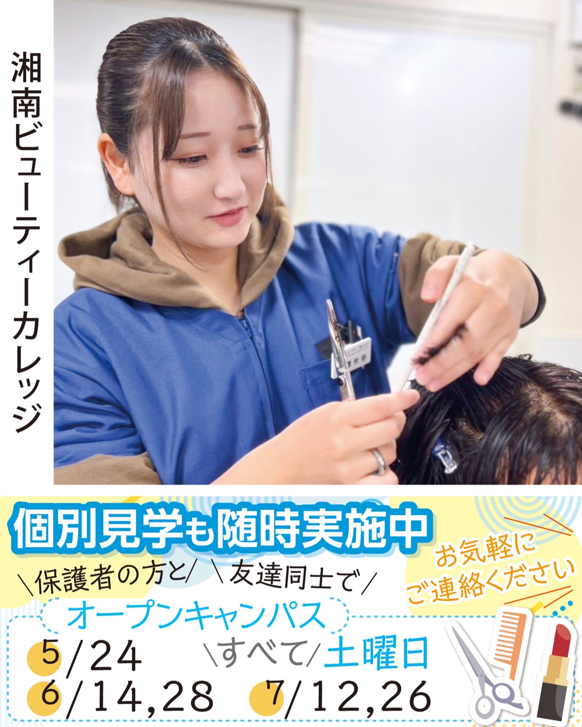 平塚駅すぐの厚生労働大臣指定養成校「湘南ビューティーカレッジ」では、美容科、理容科の生徒を募集している。早期特典付きのAO入試は6月2日(月)〜受付。オープンキャンパスは混雑前の6・7月が狙い目だ。