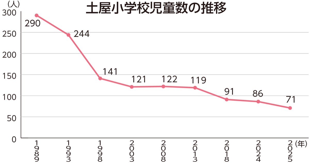 土屋小学校は、1989(平成元)年には290人だった児童数が年々減少し、2016(同28)年には100人を切り99人となり、25(令和7)年4月7日時点では71人。文科省によると、全校で12〜18学級が標準とされており、同校は学級数が保てなくなっていた。