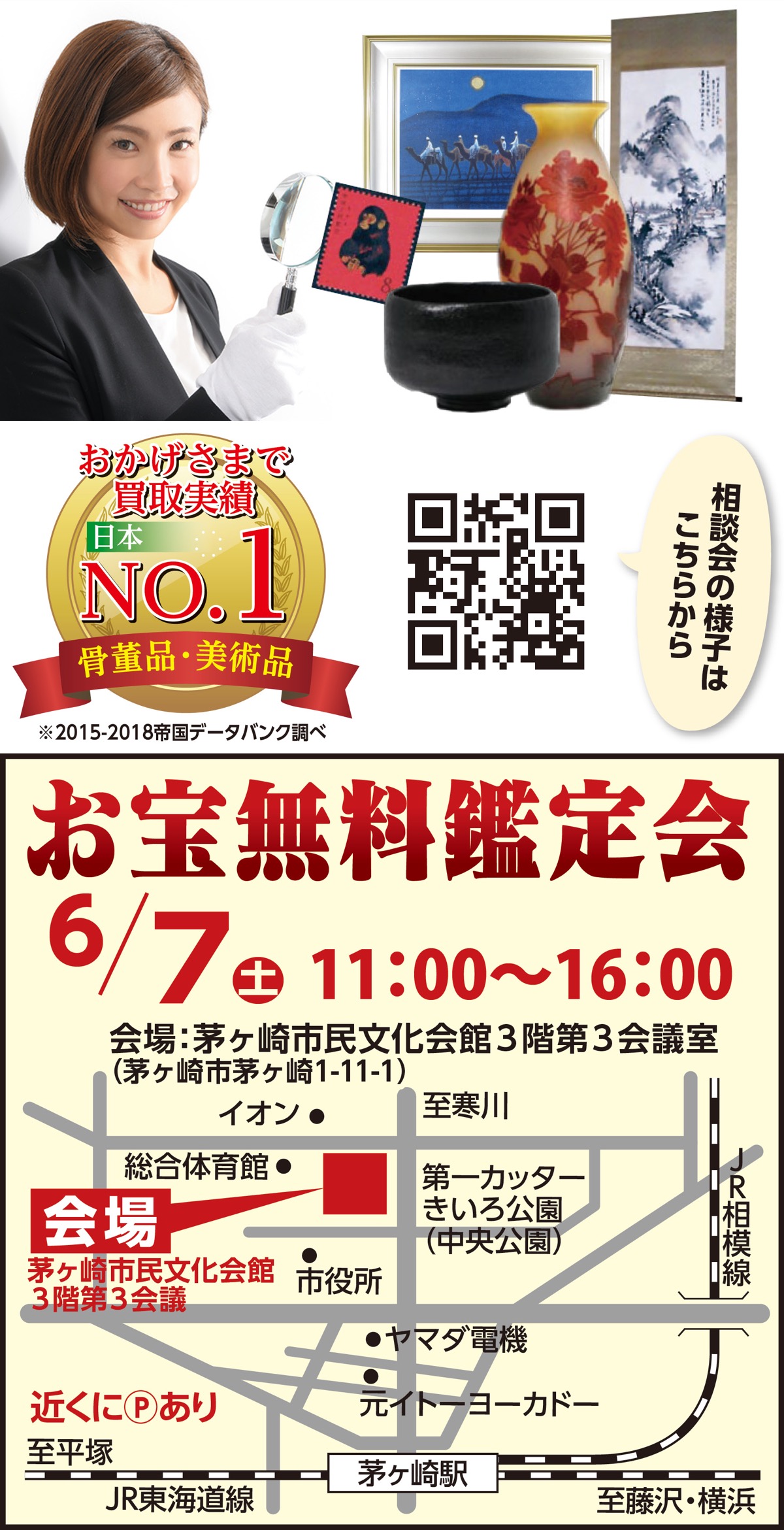 本郷美術骨董館は6月7日(土)、「お宝無料鑑定会」を「茅ヶ崎市民文化会館3階第3会議室」で開催する。同店は東大赤門前で創業40年になる美術品や骨董品の専門店。経験豊富な各分野の鑑定士が27人も在籍し、様々な提案を行う。現代アート、絵画、茶道具、古美術品等あらゆるジャンルに対応できるのも魅力。TVや新聞、雑誌にも数多くとりあげられているので安心だ。特に中国美術の買取りを強化中。予約優先。