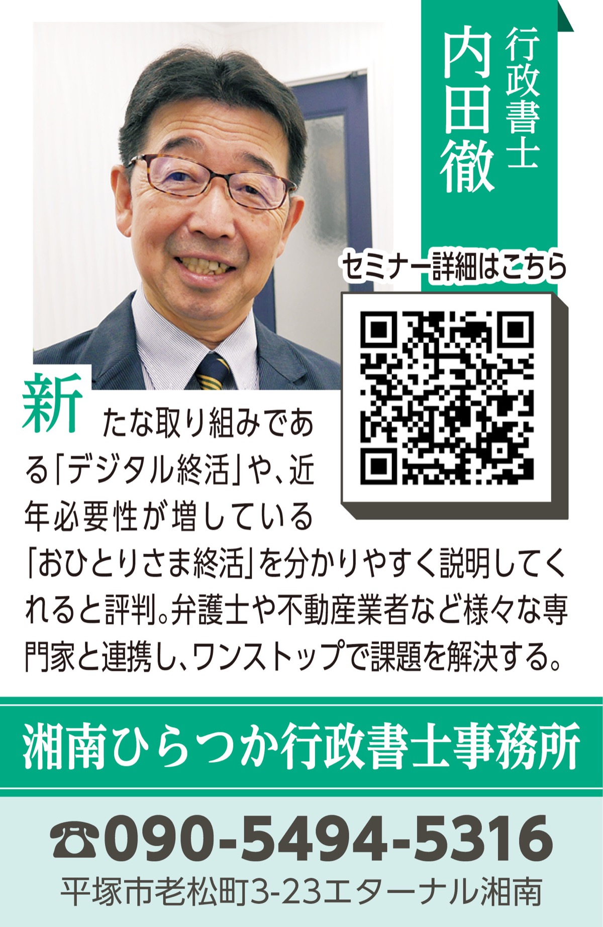 「今どきの終活事情」を行政書士の内田さんが解説する「終活・相続セミナー&相談会」が6月11日(水)、ひらしん平塚文化芸術ホールで開催される。受講無料。先着10人。電話で申し込み。