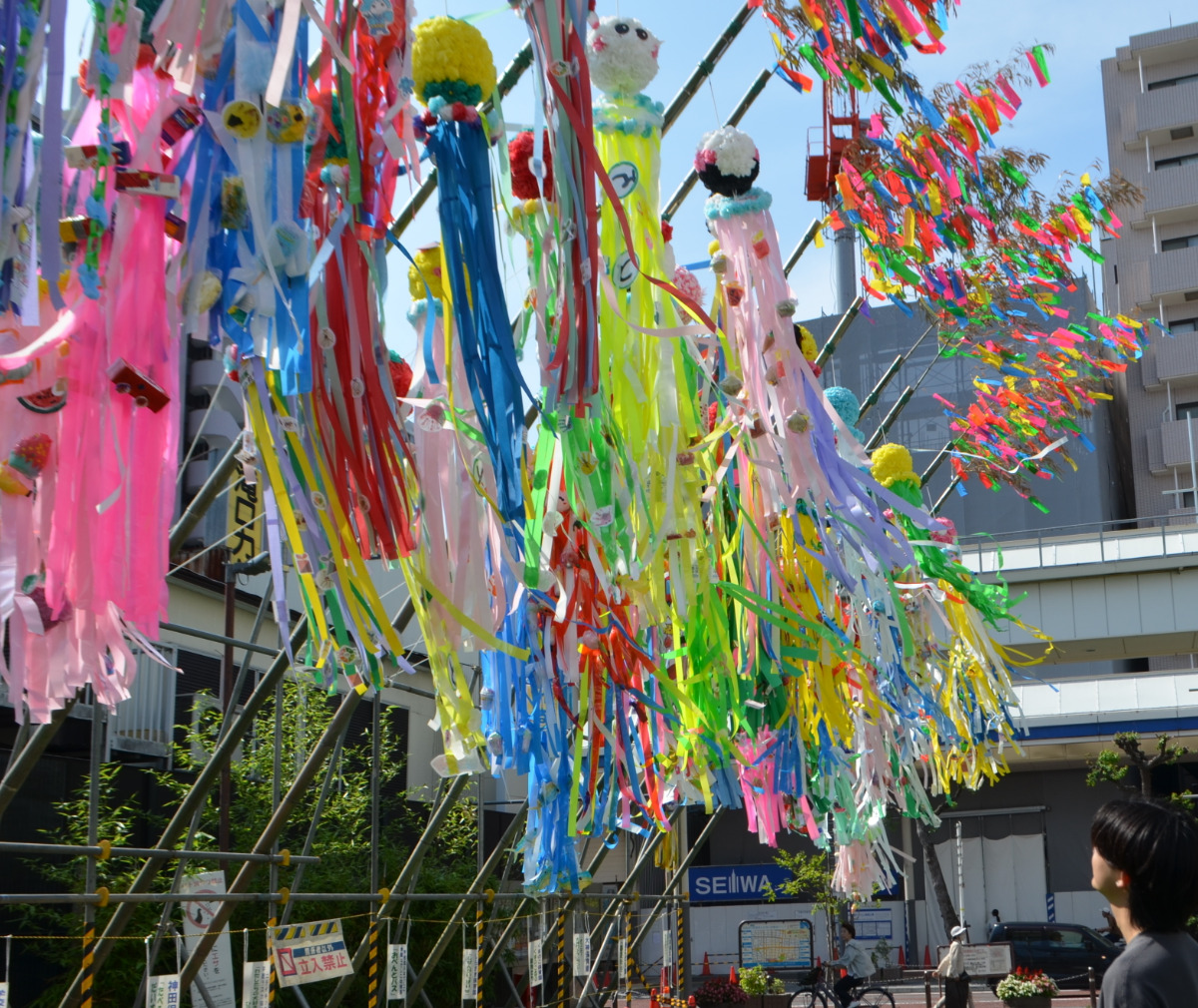 同広場を友人と通りがかった升水柊介さん(21)は「色とりどりの飾りが並んでいてきれい。七夕まつりも毎年行っているから今年も楽しみです」と祭りを心待ちにしていた。