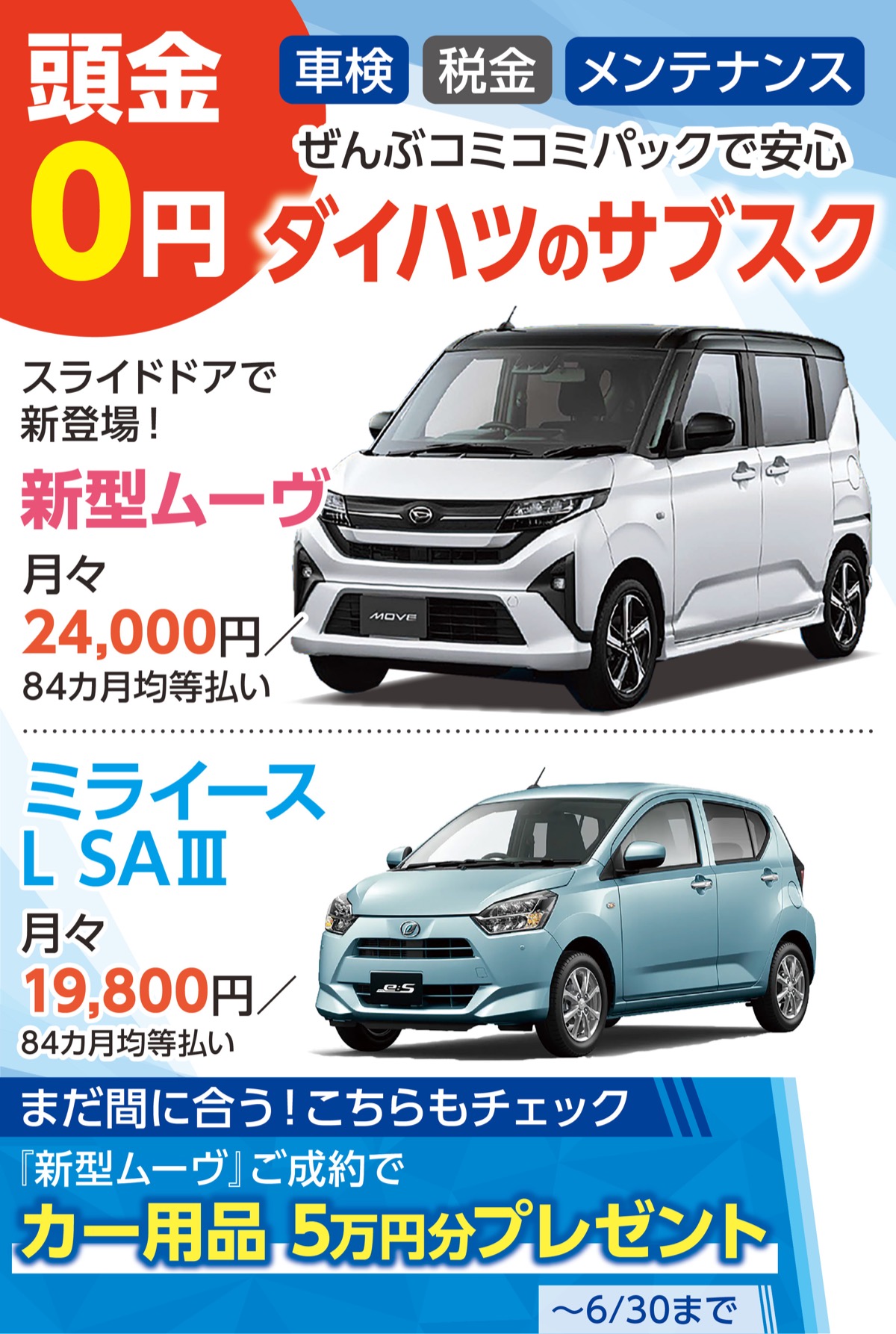 ダイハツ平塚桜ヶ丘・二宮では、スライドドアとなって新登場した「新型ムーヴ」の新車を頭金・初期諸費用0円で乗れる「ダイハツのサブスク」を展開中。ミライースなど車種も豊富で、車検や税金、メンテナンスなどコミコミパックで月々19800円〜新車に乗れるとあって、シニアのセカンドカーのほか、「コスパ重視派」の人にも好評だ。
