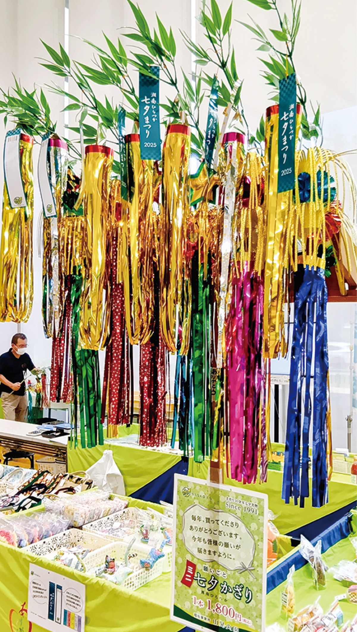 同かざりは現在、平塚市役所1階のひらつか障がい者福祉ショップ「ありがとう」などで販売中のほか、まつり期間中、紅谷町まちかど広場で販売する。1本1800円(税込)。