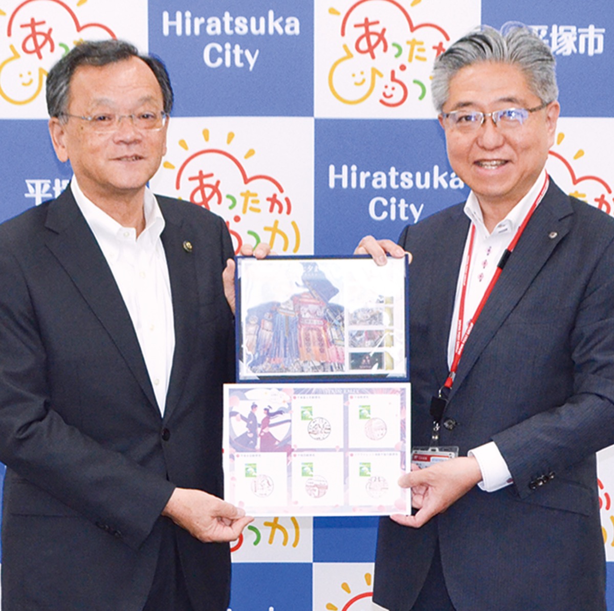 日本郵便株式会社南関東支社は、6月12日からオリジナルフレーム切手「湘南ひらつか七夕まつり〜平塚の夏 七夕まつりと花火大会〜」の販売を開始した。販売に先立ち、10日に落合克宏市長のもとを訪れ、お披露目式を行った=写真。