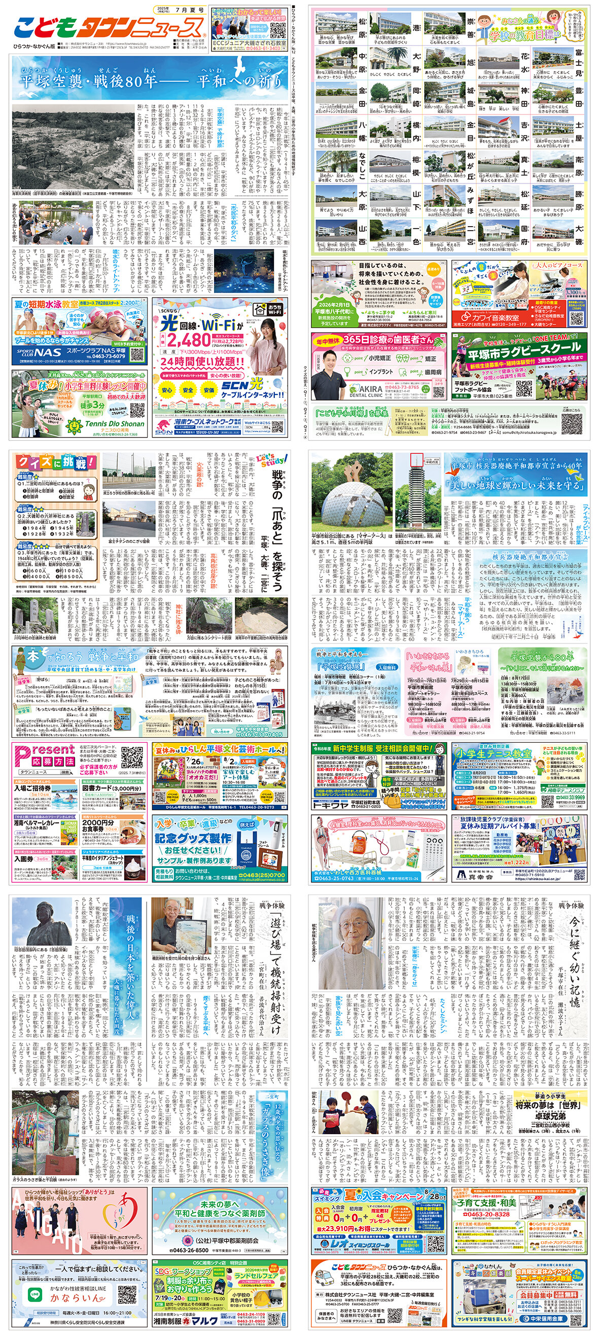 平塚・大磯・二宮・中井編集室では、平塚市内と大磯町内・二宮町内の公立小学校全児童に配布する「こどもタウンニュースひらつか・なかぐん版」の第12号を7月4日に発行しました。第12号のテーマは「戦後80年-戦争と平和」です。戦後80年を迎えた今年、平塚空襲や空襲を体験された方の話を取り上げているほか、平和に関する展示やイベントなど、夏休みに親子で足を運べる催しの紹介をしています。
