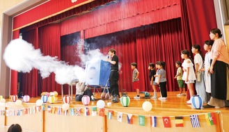 地域の子どもたちに楽しい思い出を作ってもらいたいと、毎年テーマを変えて実施されている同大会。今年は「楽しく遊んで学べちゃう!」をテーマに、東海大学サイエンスコミュニケーターによる科学実験ショー=写真=をはじめ、茶道や絵手紙、七夕飾り作り体験などが行われた。