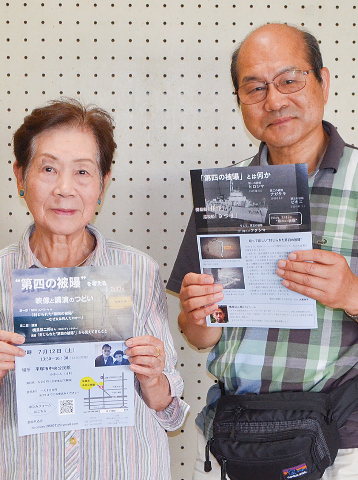 当日は2部制。第1部はNHKスペシャル「封じられた”第四の被曝”〜なぜ夫は死んだのか〜」、第2部は講演・横里征二郎さん(NHKディレクター)演題「封じられた”第四の被曝”」から見えてきたこと。午後1時30分〜4時30分。資料代500円(大学生以下無料)。大藏代表は「ぜひ、自分の目と耳で映像を見てほしい」と呼びかけた。参加希望者は二次元コードまたは同会事務局渡辺さん【携帯電話】090・1555・5090。詳細はhttp://hiromeru.jimdofree.com/