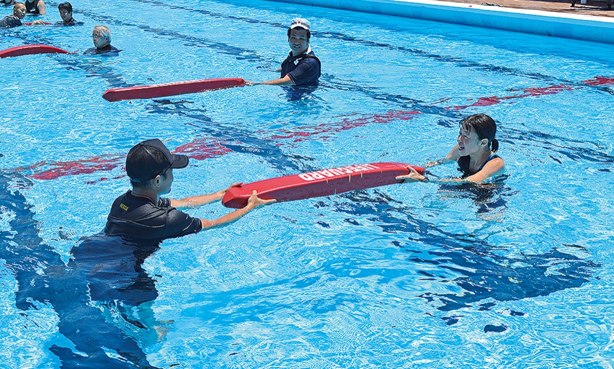 当日は、胸骨圧迫のほかAEDの使い方などをプールサイドで体験。胸骨圧迫の際の姿勢など、気を付けるべきポイントを確認した後、参加者はプールでの実践へ。足がつかないところで溺れている人を発見したときの、チューブを使った救助の仕方を、デモンストレーションを交えながら学んだ。