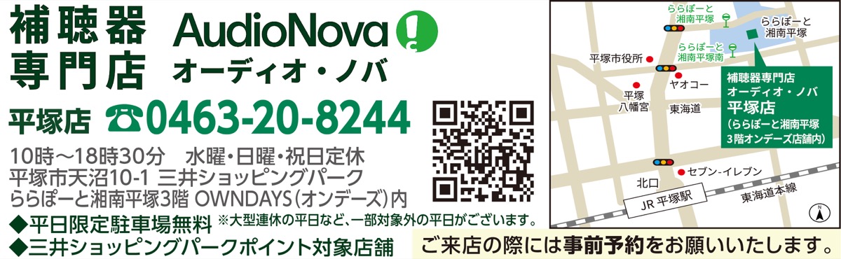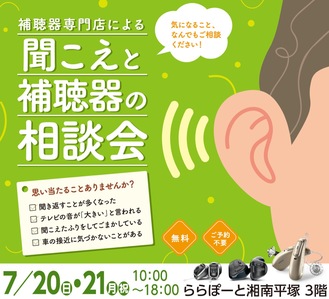 GWに好評を博した「聞こえと補聴器の相談会」が再び開催される。「リケン補聴器センター 平塚店」から「補聴器専門店オーディオ・ノバ」(ららぽーと湘南平塚 3階・オンデーズ店舗内)へと店名が変わった同店で7月20日(日)・21日(月・祝)の2日間、経験豊富な専門スタッフがプロの視点から親切丁寧にアドバイスをおくる。