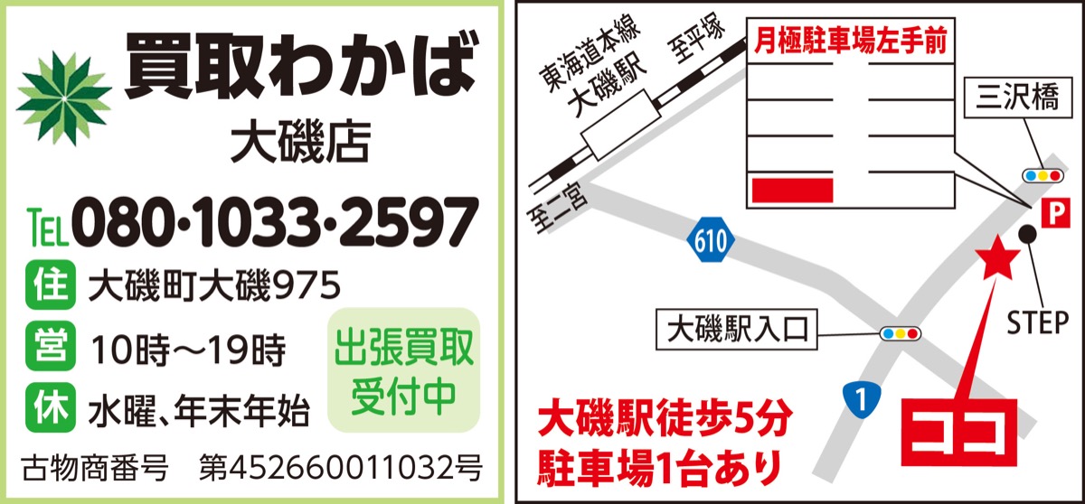 グループ全体で100万件以上の査定実績のある「買取わかば」。大磯駅徒歩5分、1号線沿いに7月31日、大磯店が新オープンした。8月31日(日)までは5つの「お得な限定買取保証キャンペーン」を開催中(詳細は図を参照)。店舗担当の加藤さんは「両親と兄が暮らしていた大磯町での出店となります。長女の美咲と親子二人三脚で運営し、地域の皆さまに貢献できるよう取り組んで参ります」と話す。