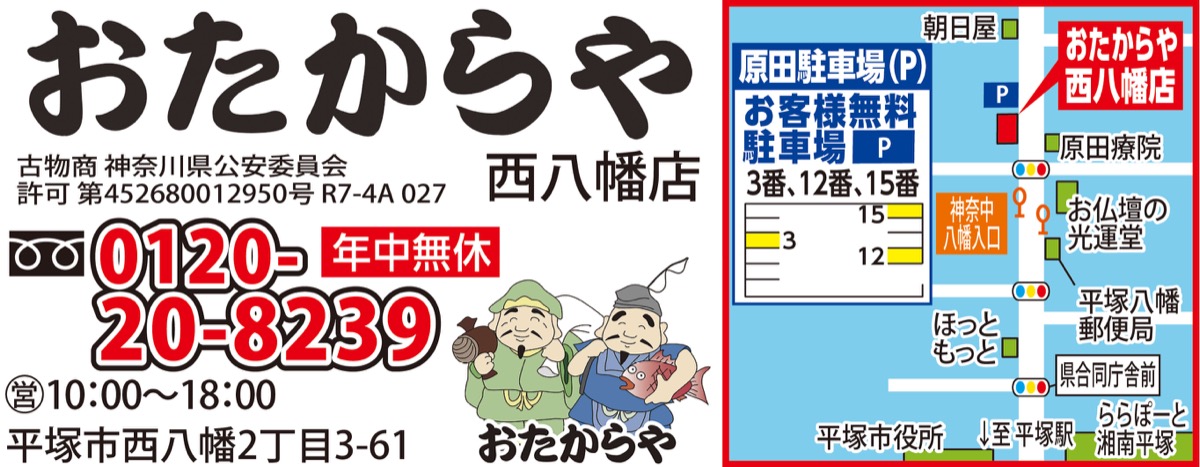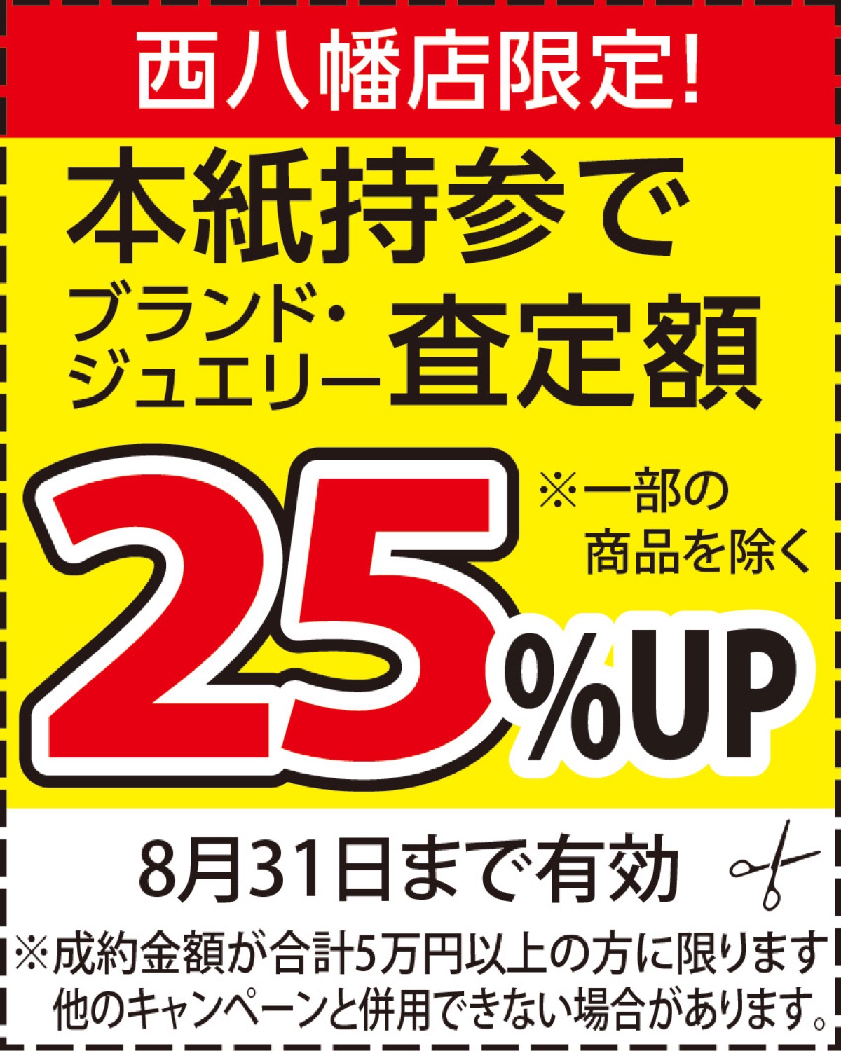 8月31日までは、【1】5点以上の成約で査定額1万円UP(成約金額5万円以上)【2】出張査定と来店予約でさらに査定額1万円UP(成約金額5万円以上※ブランド・ジュエリー以外の商品を除く)。【3】本紙掲載のクーポンを利用すれば、査定額25%アップの特典も。