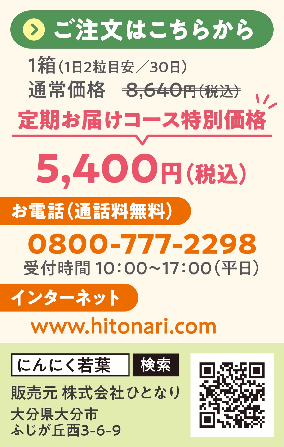 2014年の発売から10年以上、多くの人に愛用されてきた「にんにく若葉」。その確かな実績と信頼が健康をサポート。いつまでもアクティブな毎日を送りたい。そんな60代からの健康習慣として、「にんにく若葉」を始めてみませんか?続けやすいお得な定期お届けコースもご用意!