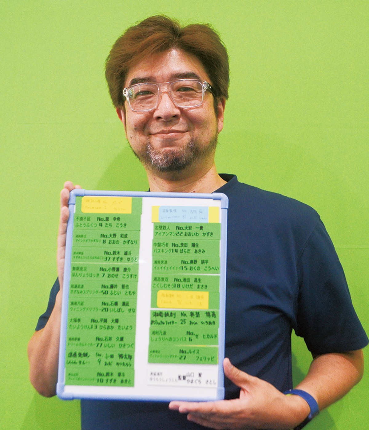 三村さんは、手製の、選手名を書いたマグネットとホワイトボードを会場に向けた選手紹介に使う。「スタメンが決まるのがキックオフ2時間前なので、手軽に並べ替えられて便利なんです」