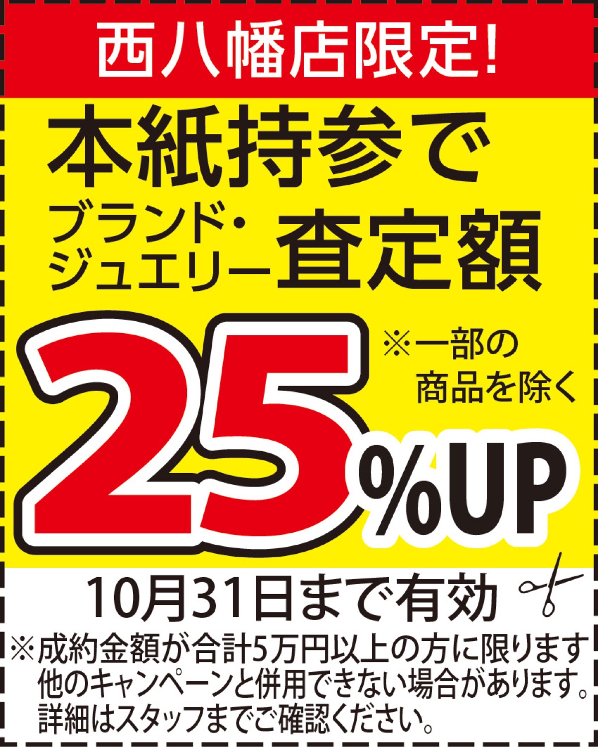 10月31日までは、【1】5点以上の成約で査定額1万円UP(成約金額5万円以上)【2】出張査定と来店予約でさらに査定額1万円UP(成約金額5万円以上※ブランド・ジュエリー以外の商品を除く)。【3】本紙掲載のクーポンを利用すれば、査定額25%アップの特典も。