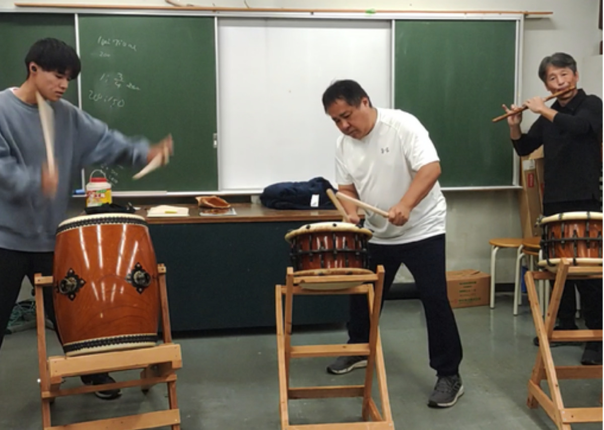 平塚市博物館のサークルの一つである「祭りばやし研究会」では、2022年からこの入野ばやしの習得に取り組んでいて、ようやく一通り演奏ができるようになったことから、今年10月11日に行われた同会の定例会に初めて「入野太鼓保存会」の中心的な2人の伝承者である、畠中直人(はたなかなおと)さんと畠中皓暉(こうき)さんの親子に来ていただき、交流会を開催する運びとなった。