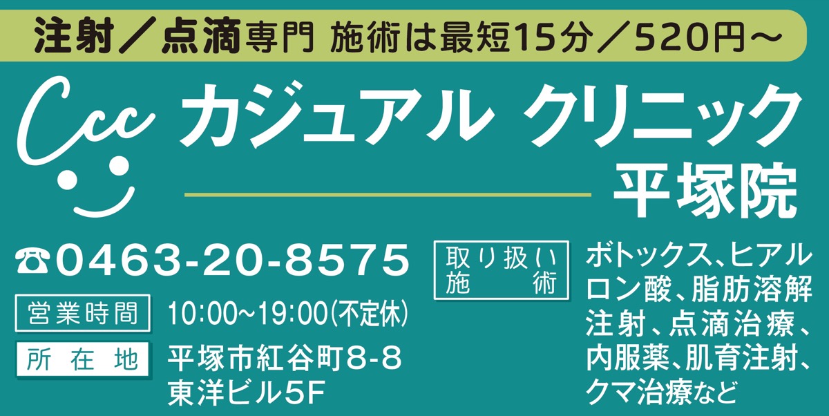 手軽にほうれい線の改善(3000円〜/自由診療)ができることで話題の美容注射・点滴専門店「カジュアルクリニック」(平塚駅西口徒歩1分)が、11月に開業1周年を迎え、感謝祭を実施している。