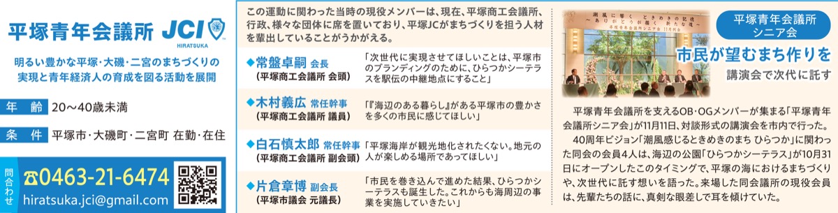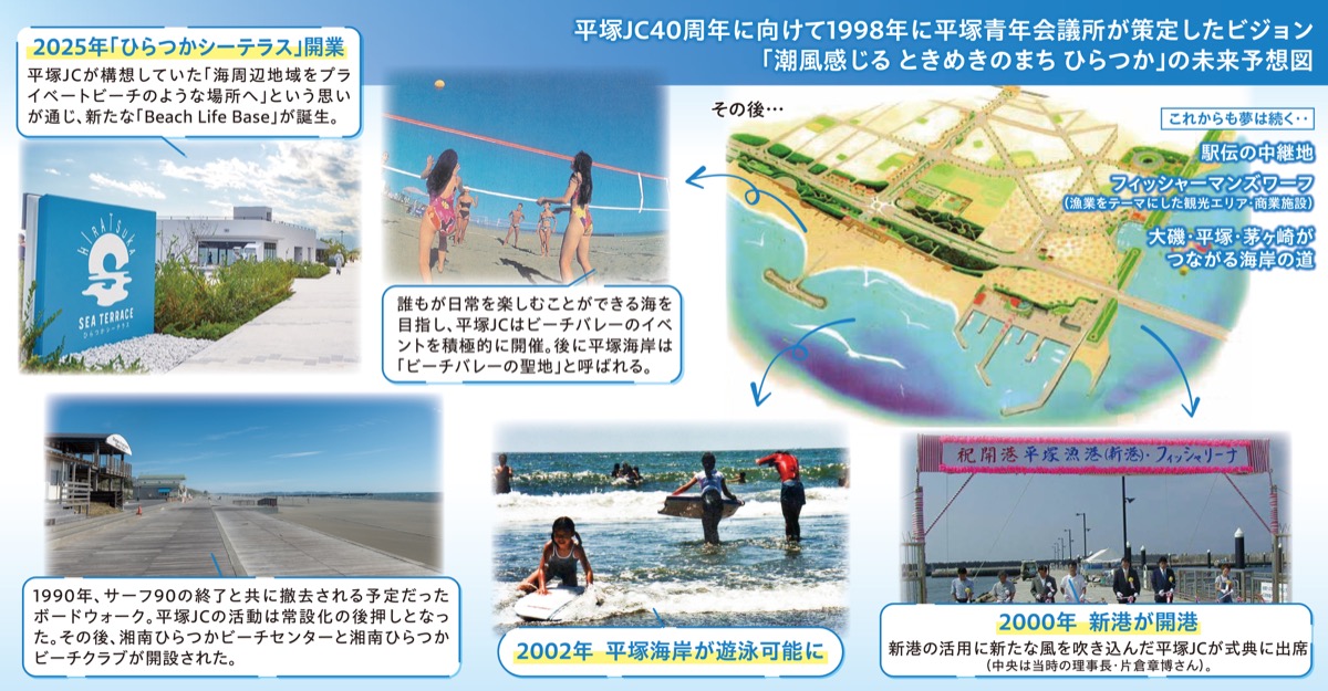 平塚青年会議所(平塚JC)は設立以来、地域の人や行政と共に様々なまちづくりを行ってきた。特に、1990年前後に始まった平塚海岸の魅力を高める事業は、10月31日に開業した海辺の公園「ひらつかシーテラス」につながるものとなった。
