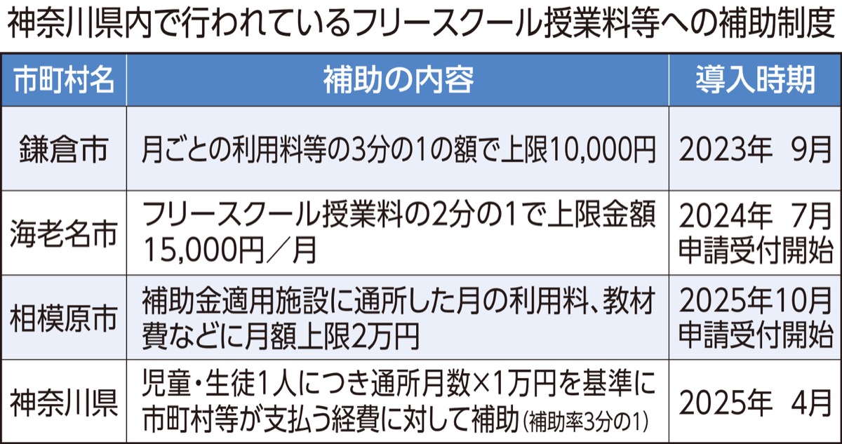 独自に保護者を支援する自治体も増えている。鎌倉市は23年9月、フリースクールの授業料等の一部を補助する制度を導入。その後海老名市が24年7月、相模原市も今年10月から同様の仕組みをスタートさせている。