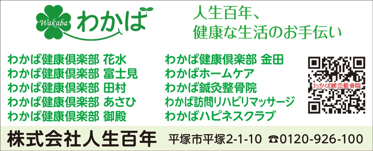 「人生100年」という言葉も耳に馴染んできた昨今。平塚市に本社を構える株式会社人生百年は、社名の通り、「健康寿命」を重視した充実した人生100年を送ってもらうための「人生の並走者」。介護保険を活用したリハビリ型デイサービス「わかば健康倶楽部」や、医療保険を用いて行われる「わかば訪問リハビリマッサージ」、国家資格を有したスタッフが揃う「わかば鍼灸接骨院」、1日デイサービス「わかばハピネスクラブ」など多彩なサービスでシニアも、その家族の暮らしも支えている。