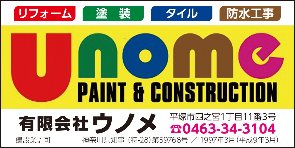 平塚市四之宮に本社を構える有限会社ウノメ(宇野女智代表)は、リフォーム全般のほか、塗装やタイル、防水工事などを手掛ける地域密着企業。高圧洗浄などの技術も取り入れ、ただきれいにするだけではなく、「きれいが続く」仕事ぶりでリピーターも多い。