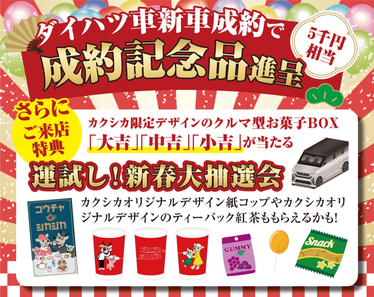 ダイハツ平塚桜ヶ丘店・二宮店では、ダイハツ車の新車成約でプレゼントがもらえる「大初夢フェア」を1月12日(月)まで開催中。さらに、来場特典でクルマ型お菓子BOXが当たる「新春大抽選会」も実施。人気キャラクター・カクカクシカジカの限定紅茶や、紙コップがもらえるかも。新年最初の運試しはダイハツへ!