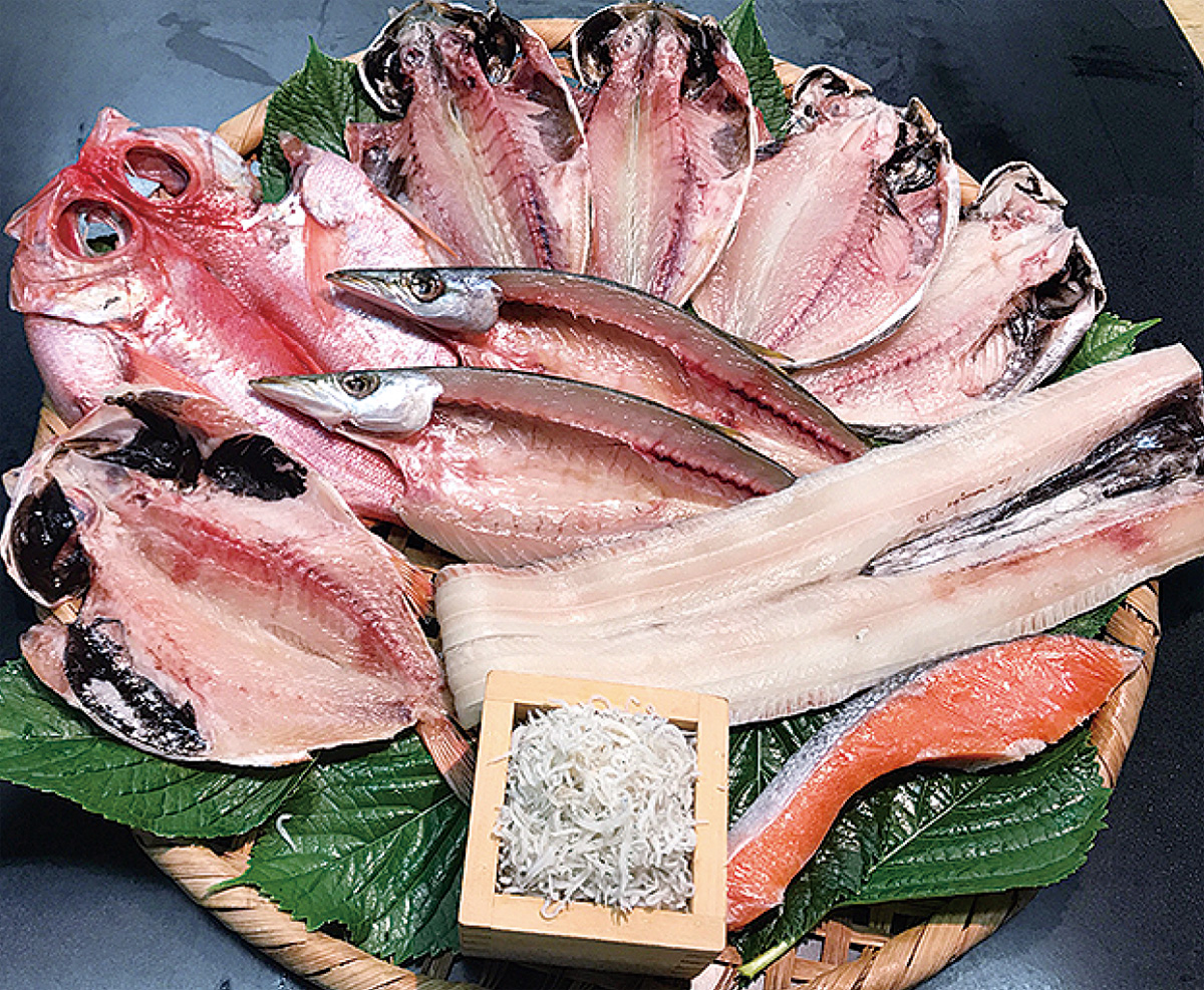 お歳暮限定セット(送料込4420円)は上鯵・大えぼ鯛・上かます・金目・のどぐろなど高級干物7種10枚にしらす干しを添えた。セットは2260円〜。単品は鯵(100円)や特大ほっけ(400円)など多数。開場は午前10時〜午後4時30分。