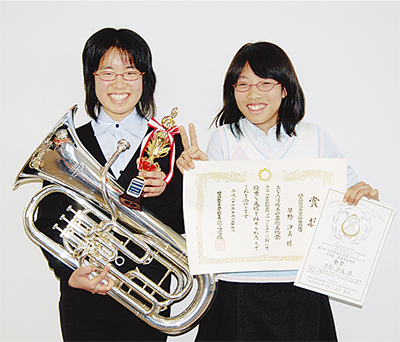 早野さんがコンテストに参加したのは、2年前に中井町立中井中学校の3年生だった音楽教室の先輩が同じコンテストでユーフォニアムを演奏し、金賞を取ったことがきっかけ。カステレード作曲の「幻想的協奏曲」を選び、昨年4月から練習を始めた。ピアノ伴奏は音楽教室の仲間で卓球部員の松田美紗さん(2年生)に依頼。伴奏にも高度な演奏技術が必要なため、二人は授業が始まる前の朝や放課後を使い、休日も練習に励んだ。