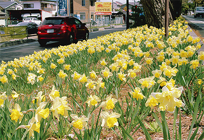 大磯中学校から旧滄浪閣に至る国道1号線の中央分離帯で今年も水仙が満開になった。長さ約300メートルに渡って鮮やかな黄色い花や優しいクリーム色の花々が、ドライバーや道行く人たちの目を楽しませている。