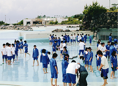 同ホテル施設内にある大磯ロングビーチがまもなく今夏の営業を始めることもあり生徒たちはロングビーチの清掃や周辺の草むしりをおこなった。生徒たちは、たわしでプールの壁や底を磨いた。