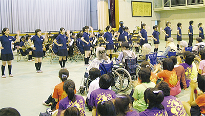 今年の海鳴祭のテーマは『共生〜一つになろう大磯』。初日は「サンキッズ大磯」の園児と「富士白苑」のお年寄りを招待し、地域の人との交流を深めた。招待された園児やお年寄りは、体育館でおこなわれた同校吹奏楽部による演奏を鑑賞。園児らはお兄さん、お姉さんの演奏や踊りに喜んでいた。また、お年寄りは、生徒の迫力ある演奏に大きな拍手で応えていた。