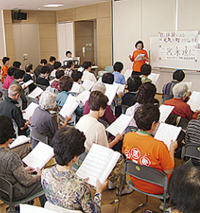 歌いながら体を動かし、笑顔で元気になろうと行われている『元気の出る歌の集い』。10月7日に行われた集いで二宮町の愛唱歌が初披露された。歌は、二宮町協働まちづくり補助金事業を受けて企画されたもの。二宮町を表現した歌が欲しいと考えた同集いの鮫嶋さんは、知り合いを通じて童謡、社歌、校歌、記念歌など様々な分野で音楽を提供している鍋島佳緒里さんに曲を依頼した。タイトルは『二宮、永遠(とわ)に』。