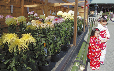 先週の土日は菊鉢の前で記念写真に収まる七五三参りの子どもたちの姿が見られ、菊花のプレゼントや野点も行われた。