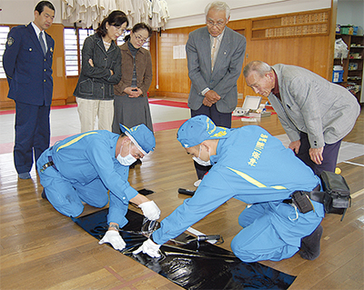 警察署の業務運営に地域住民の声を活かすことを目指して組織されている大磯警察署協議会(坂井俊六会長)の会合が同署で10日に開かれ、協議会委員が鑑識活動を視察した。 鑑識活動の視察は警察の仕事について理解を深めてもらおうと、同署が実施。刑事ドラマで見かける、足跡と指紋の採取を刑事課の鑑識係2名が実際にやってみせて説明した。