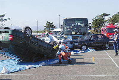 訓練は、西湘バイパスで観光バスや車など計7台による玉突き事故が発生、多数の負傷者が出たことを想定して実施。会場にはバスや横転した車、フロント・後部が損傷した車などを用意。それぞれの車両に搭乗者役の人たちが乗り込んだ。消防に通報するところから訓練開始。救急車や消防車、警察が駆けつけ救助にあたった。乗客役の人たちは「早く助けてくれ」「胸を打った」など本番さながらの演技を披露、救助隊も真剣な表情で救出にあたっていた。また、別の場所では医療機関チームが「どこが痛いですか」「腕はあがりますか」など声を掛けながら救出された負傷者の手当てにあたっていた。大磯町消防本部の二宮栄治消防長は「大きな事故があったときは、各関係機関との横の連携が大事です。訓練を通して皆が学んでいければ」と話している。