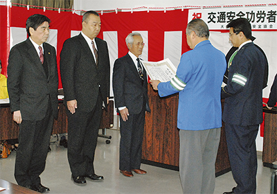 地域の交通安全に尽力し、顕著な功績があった人と団体、無事故無違反のドライバーを称える、平成23年度交通安全功労者・優良運転者表彰式が10日、大磯警察署講堂で行われた。交通指導員を務める柳田英治さん(大磯町)が県知事表彰を受章。約25年にわたり模範運転を続けてきた8名が交通栄誉章の伝達を受けた。